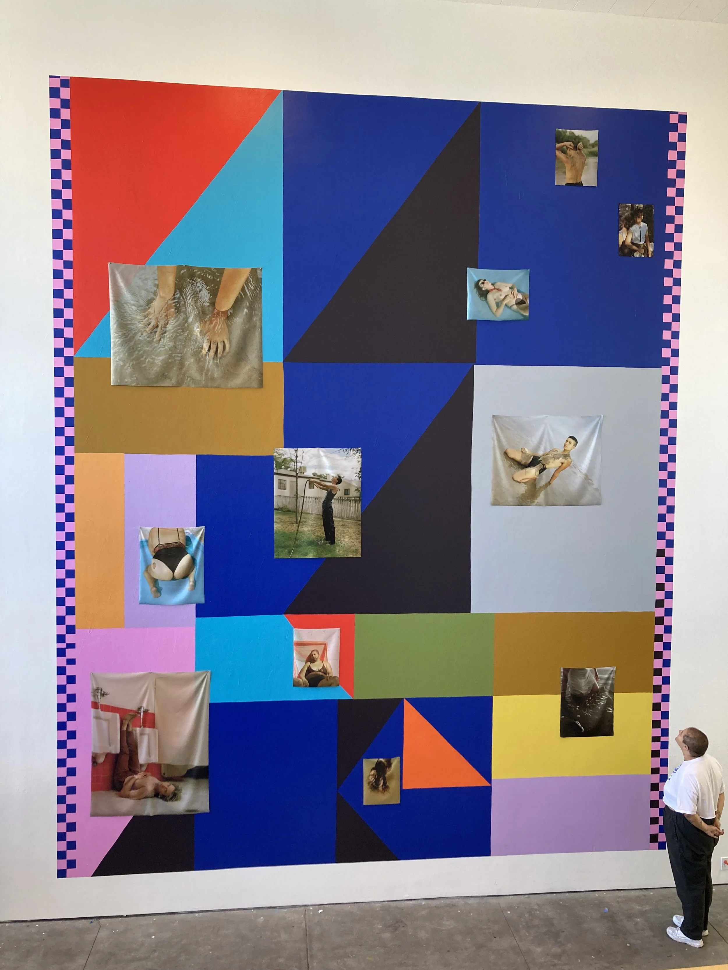 Through this collaboration Curreri and hermano navigated intergenerational difference as it relates to picturing queerness. The portraits printed on fabric vary in scale and their position engages politics of refusal, intimacy, joy, and power. The painting holds the images – the checkerboard pattern running along the vertical edges mimic selvedge structure that allows for freedom and play in the body of a weaving. Some images are out of reach of visitors and require a repositioning of one’s body to access the image to enact politics of queer privacy and refusal that are vital yet threatened in today’s political and social climate.